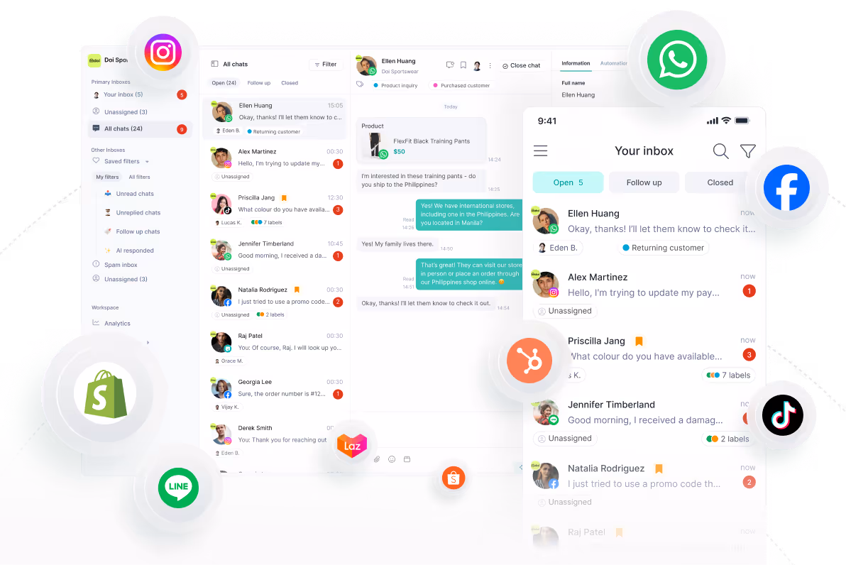 Seamlessly integrates Shopee, Lazada, TikTok Shop, Facebook, Instagram, LINE OA, and website live chat into one unified inbox.